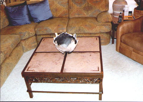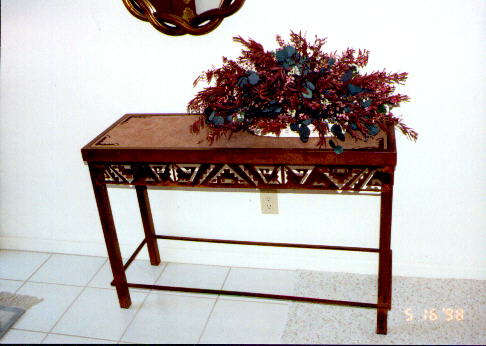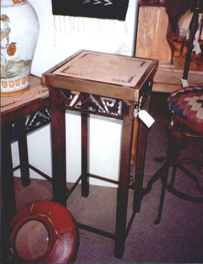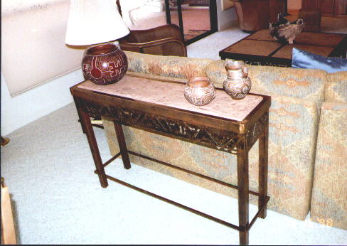 Stone: One to two inches thick flagstone Mined in Ashfork Arizona Sandblasted and finished by Su Casa Designers Six coats of stone lacquer, waterproof Steel: 1 by 2 inch extruded steel frame 1.5 by 1.5 inch extruded steel legs 12 gauge hot rolled steel decorative panels with Hopi design 0.5 inch solid steel lower leg brace Caps: plastic bottom end caps for floor protection Finish: natural rust finish 6 coats metal lacquer coating any size available